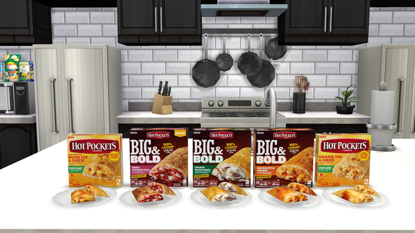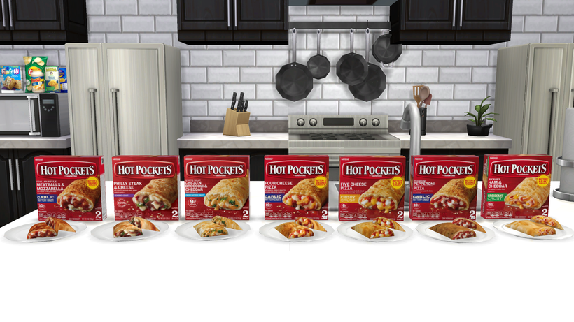 구매/건축 모드나 Insimnia의 '커스텀 식료품 구입 금전 등록기'(>바로가기)를 사용해 핫 포켓 12종을 구입할 수 있습니다. 구입한 핫 포켓 상자는 상자 채로 냉장고에 보관이 가능하며, '상자 열기'를 누르면 식재료가 개인 가방으로 옮겨집니다.